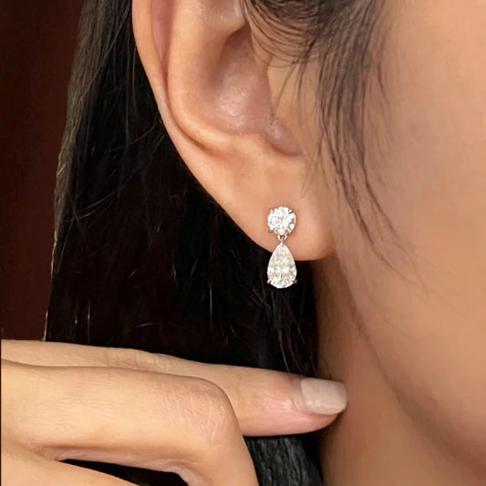 Duo | Drop Earrings 3ct Round & Pear Cut Moissanite (Solid Gold)