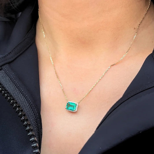 Lindy | Lab-Grown Emerald & Diamond Halo Necklace (Solid Gold)